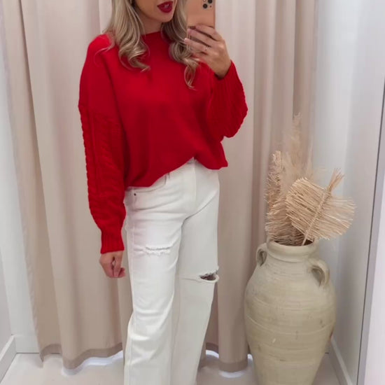 A cozy essential with elevated details, this oversized round-neck sweater features beautifully textured cable knit sleeves for a timeless, chic touch. Designed with a relaxed fit and soft blended yarn, it’s the perfect mix of comfort and style—ideal for layering through cooler days.