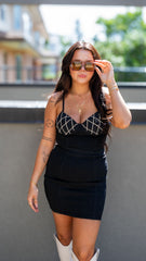 • Structured bustier top with silver diamond-shaped detailing—adds sparkle and edge
