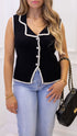 Channel effortless old money style with this timeless black knit vest top. Featuring a flattering v-neckline, crisp white accents, and sleek white button detailing, it’s the perfect mix of classic and chic. Crafted in a super stretchy knit, it offers comfort while maintaining a tailored look that’s easy to dress up or down.