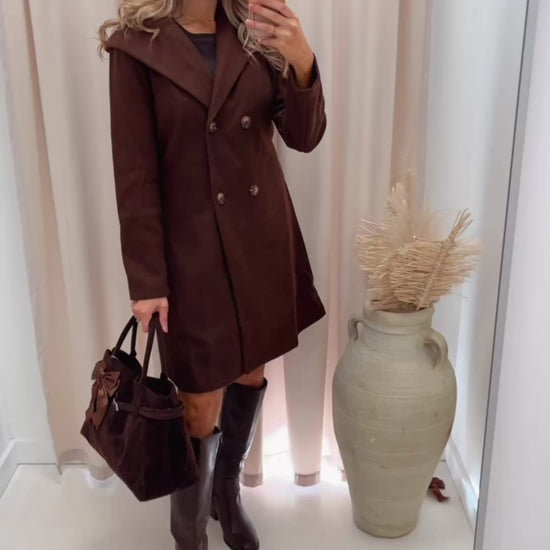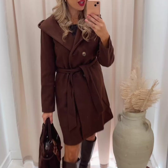 Elevate your outerwear with this refined double-breasted coat in a timeless neutral tone. It features a cozy hood, long sleeves, and a flattering sash belt to cinch the waist. Functional side pockets add convenience, while a back pleat creates beautiful movement and shape. Designed in a classic knee length for an elegant, versatile finish.