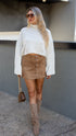 Elevate your everyday look with this suede mini skirt, designed with chic front patch pockets for a touch of retro charm. Its sleek silhouette and soft suede finish make it versatile enough to style up or down — pair it with boots for a night out or sneakers for a casual daytime vibe.