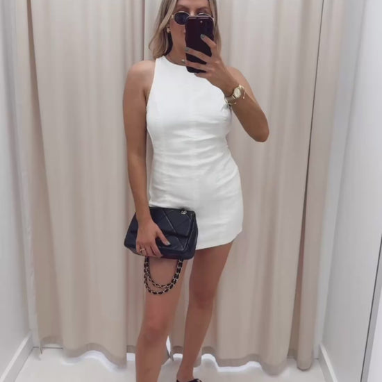 This all-white denim mini brings a fresh, structured take to seasonal dressing. Lightweight and super-stretchy, it features a high neckline and bold open-back detail—ideal for pairing with white undergarments.