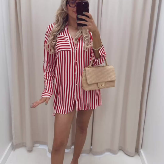 Make a bold yet relaxed fashion statement in crisp, high‑contrast stripes. This oversized shirt dress features a loose fit with a button‑down front and classic collar—ideal for breezy summer styling or layering into fall.