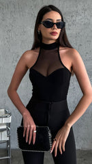 Feminine meets modern in this sleek black sleeveless knit top, made in Turkey with refined craftsmanship. Featuring a subtle sweetheart neckline framed by a mock neck mesh panel, this piece combines structure and softness for a beautifully flattering silhouette.