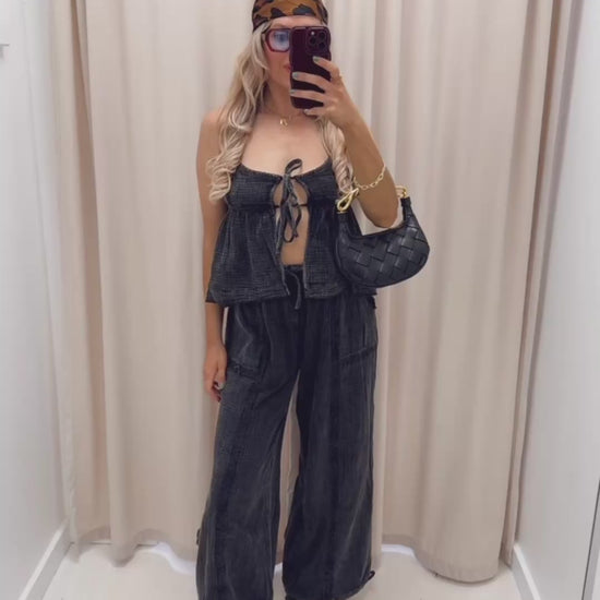 Bottom: Coordinating wide-leg gauze pants with patch pockets, adjustable ankle ties for cinched or straight-leg styling, and a soft pull-on waistband.