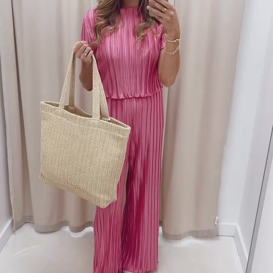Meet Vivian, a dreamy two-piece ensemble featuring high-rise accordion-pleated,straight leg, satin pants and a cropped crew-neck tee. Designed to blend ease and polish, it’s your go-to for relaxed luxe moments this summer.