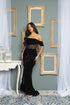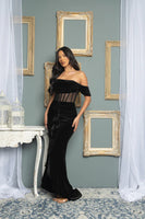 Solid color off the shoulder maxi velvet dress with a high low ruffle slit, cowl neck, back zipper, and mesh corset waist. Dress is fully lined except on mesh. Very stretchy.
