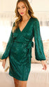 Emerald Sequin Long Sleeve Wrap Mini Dress