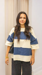 • Two Styles: Available in **Pineapple Navy** (classic nautical) and **White Cherry** (soft and sunny) to suit your mood.<h3>Polly Color Block Top – Aemi + Co</h3><p>The ultimate weekend tee. This relaxed-fit top features bold, wide stripes and exposed seam details for a casual, effortless vibe. Its oversized silhouette and breezy 100% cotton fabric make it the perfect grab-and-go piece for sunny days.</p><br><strong>Quality Description</strong><ul><li><strong>100% Cotton:</strong> Made from soft, breathable cotton that keeps you cool and comfortable all day long.</li><li><strong>Raw Edge Detail:</strong> Designed with exposed, raw-edge seams that give the tee a cool, lived-in texture.</li><li><strong>Oversized Fit:</strong> Features a loose, boxy cut with dropped shoulders for a relaxed and flattering drape.</li></ul><br><strong>Why You'll Love It</strong><ul><li><strong>Retro Vibes:</strong> The wide color-block stripes give it a nostalgic, surf-inspired aesthetic.</li><li><strong>Two Styles:</strong> Available in **Pineapple Navy** (classic nautical) and **Misty Peach** (soft and sunny) to suit your mood.</li><li><strong>Easy Care:</strong> A durable cotton staple that gets softer with every wash.</li></ul><br><strong>Style It</strong><ul><li><strong>Summer Casual:</strong> Pair with denim shorts and slide sandals for an easy beach outfit.</li><li><strong>Athleisure:</strong> Wear over biker shorts with chunky sneakers for a sporty on-the-go look.</li><li><strong>Tucked In:</strong> Front-tuck into high-waisted jeans to give the oversized shape some structure.</li></ul>